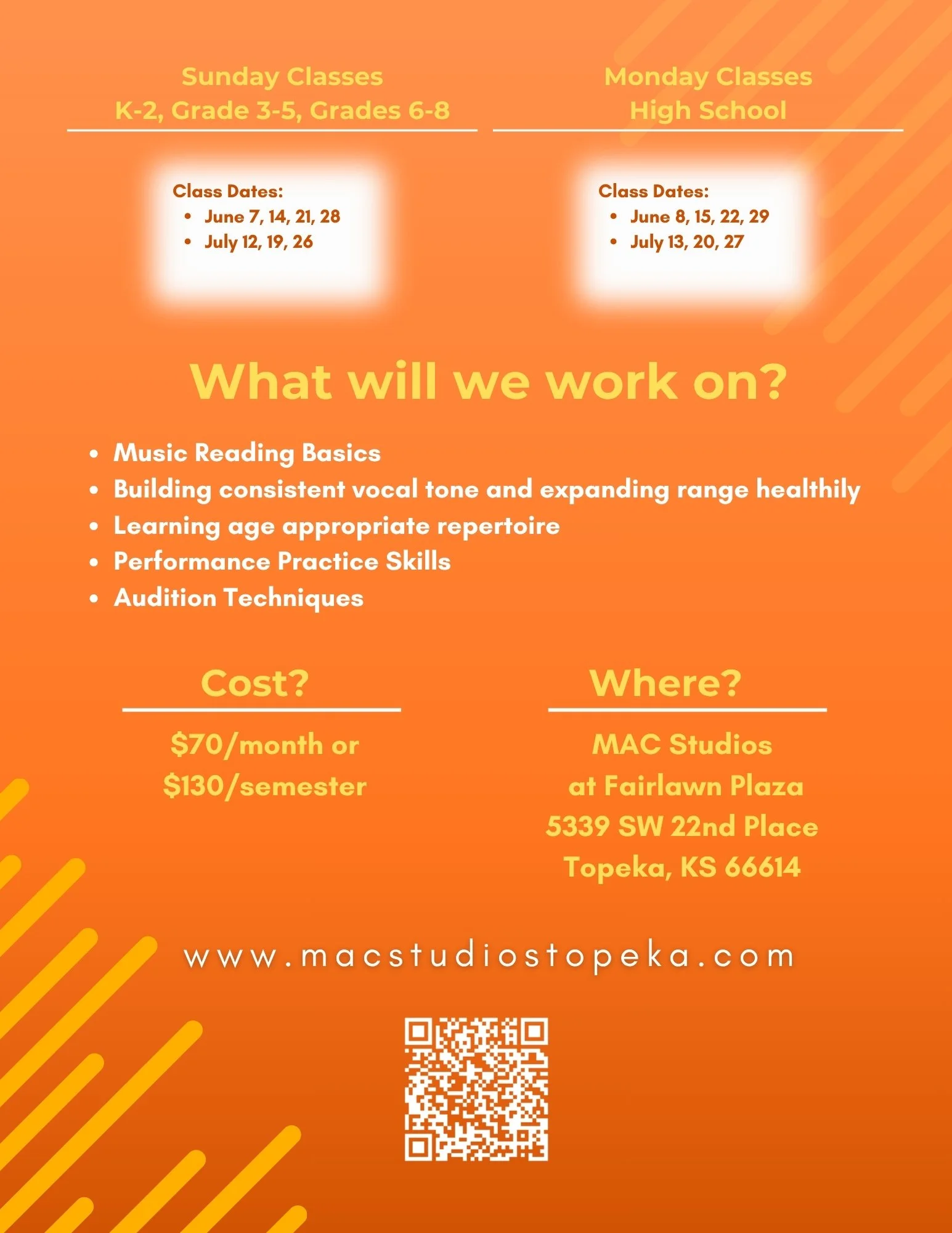 Class will be held at MAC Studios at Fairlawn Plaza: 5339 SW 22nd Pl, Topeka, KS 66614